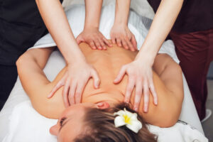 - Massage in four hands in SPA salon. Two massaging therapist makes massage back for woman. Sensual tantric massaging in 4 hands of professional masseur. Concept of health care and female beauty